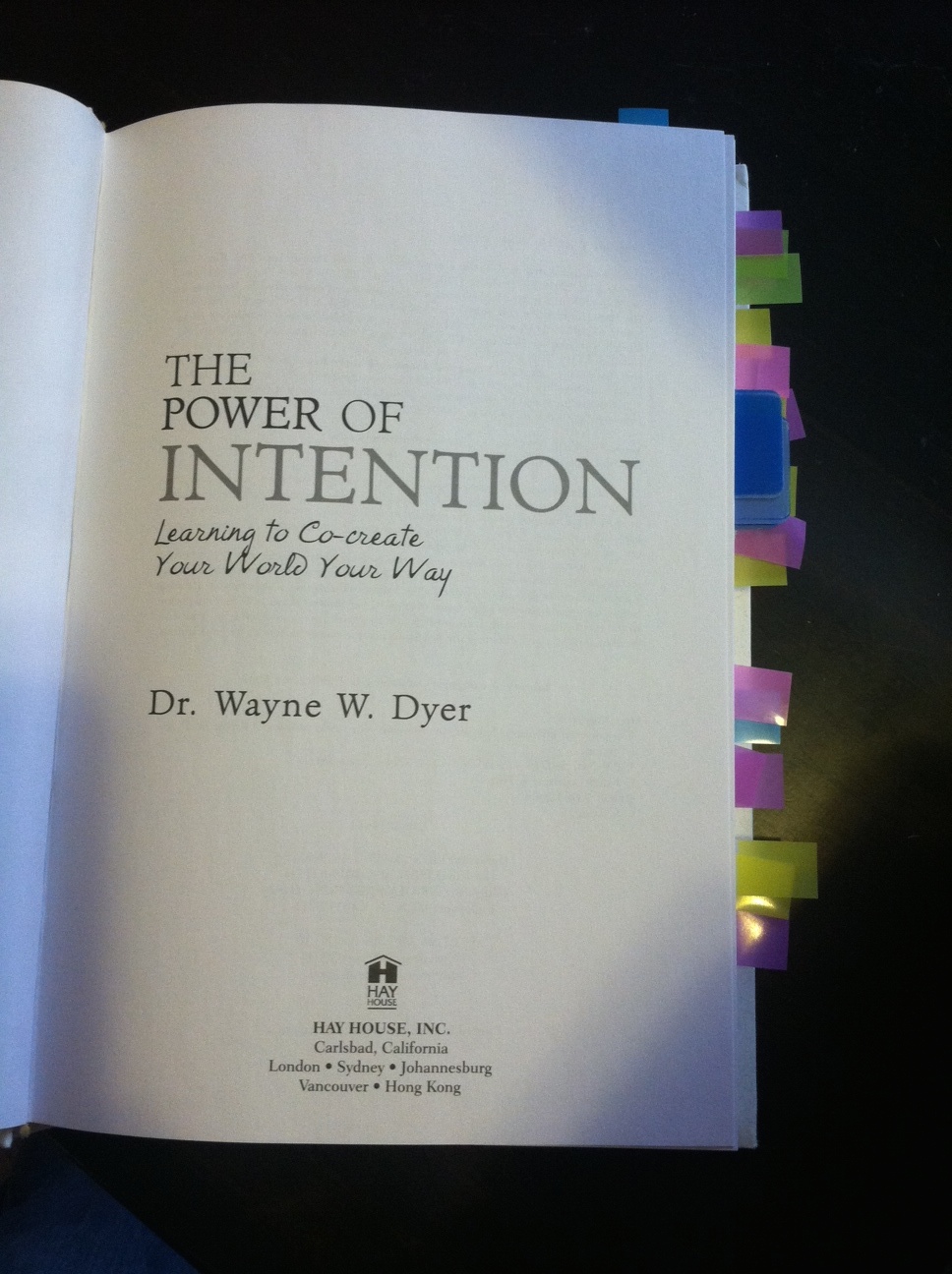 Post-it page tab thingies (OK that is not their official name but that’s what I call them.) I love these things. I am reading “The Power of Intention” by Dr. Wayne W. Dyer and as you can see I am finding some post-it worthy items. This is why, for books like this, I still love a real book.