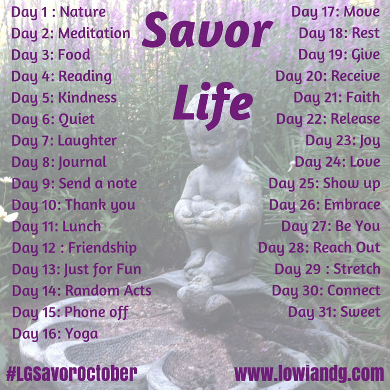 We will be posting a new photo and the day’s theme every day, beginning October 1. We will include a few ideas of how that theme can be interpreted to Savor Life but ultimately that decision is up to you.