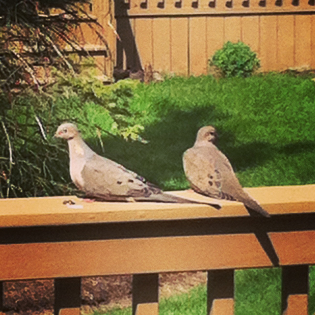 I looked up and saw two pigeons frolicking on the railing of our deck. They were particularly attentive to one another but I looked away and continued what I was doing.