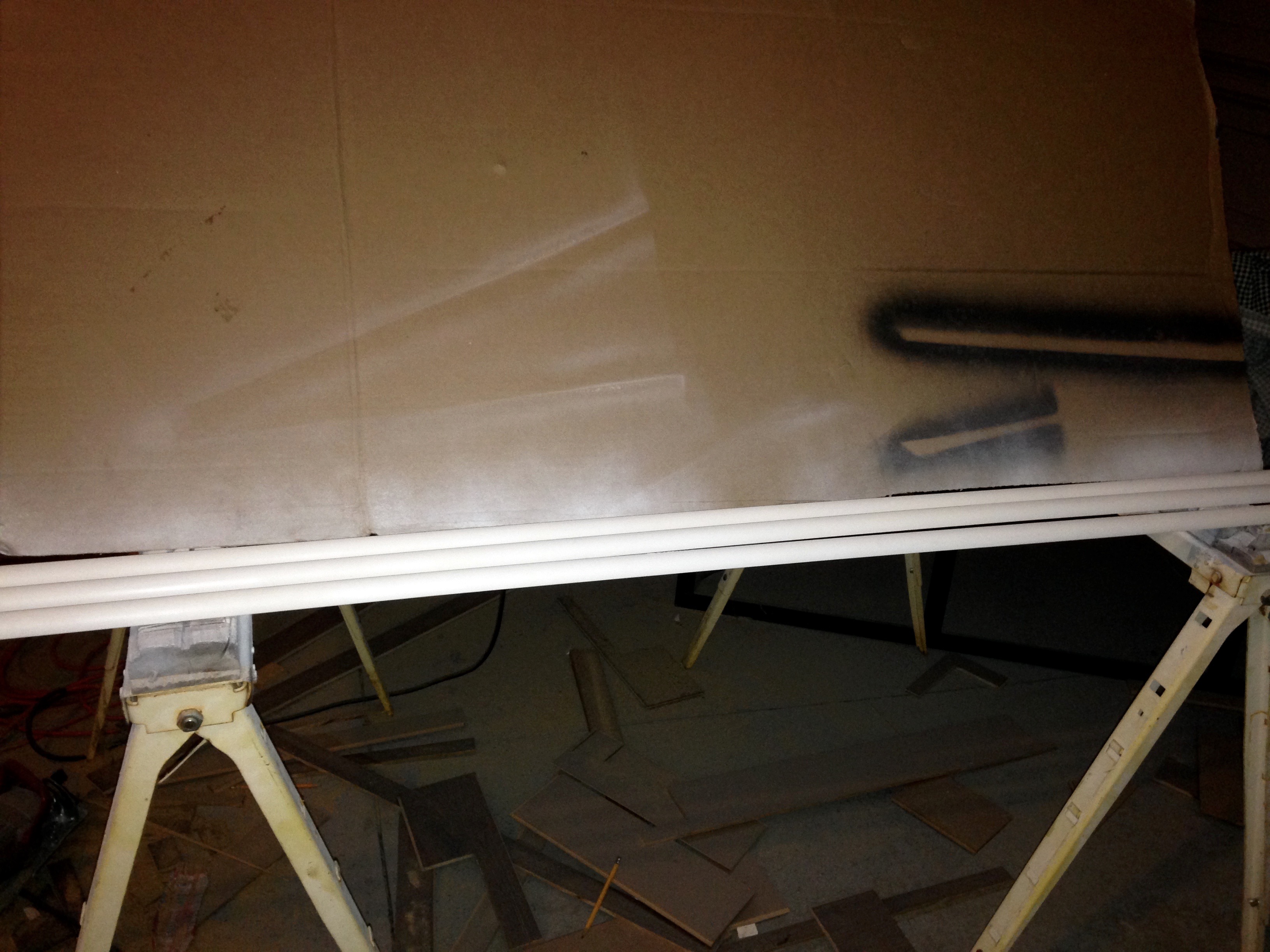 Then when I returned home, I checked email and handled some “urgent” issues. Then, to be ready for my Dad to put the finishing trim around the new floor, I went out to spray paint the remaining quarter round. I sprayed two pieces without any fanfare and then promptly knocked one of them, still wet, onto the floor into the sawdust.