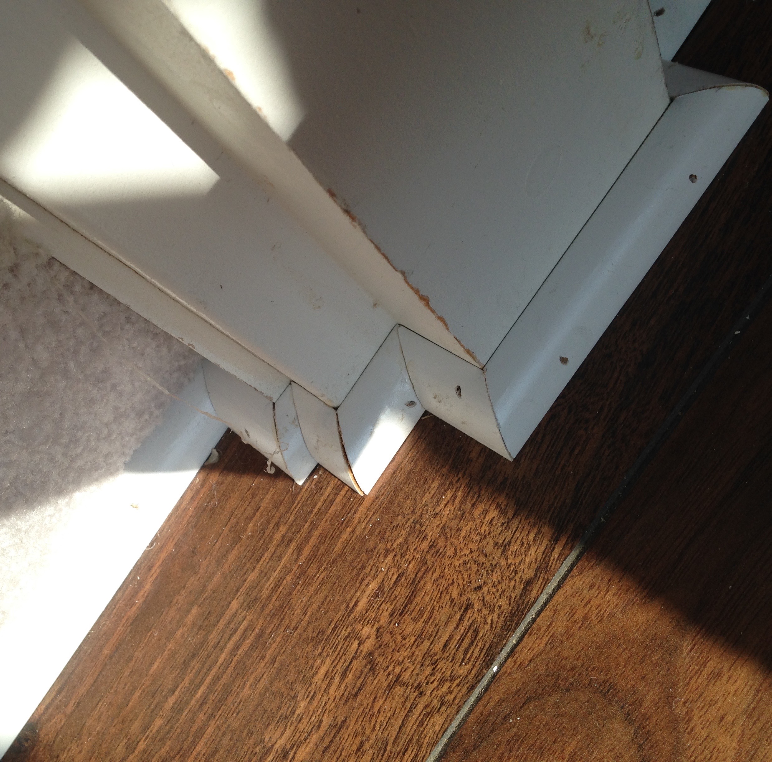 So then I gathered all these intricately cut corner pieces to put around the bottom of the stair case. Holy angles, batman.