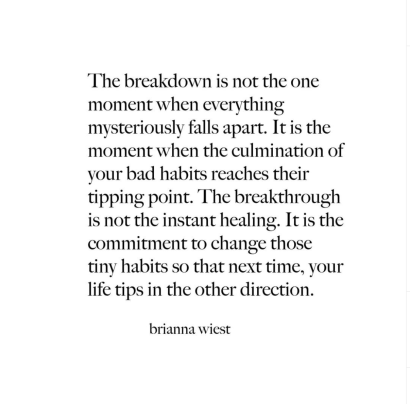 “The breakdown is not the one moment when everything mysteriously falls apart. It is the moment when the culmination of your bad habits reaches their tipping point. The breakthrough is not the instant healing. It is the commitment to change those tiny habits so that next time, your life tips in the other direction.”