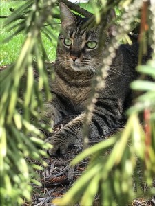 But animals are equally wise when it comes to wanting to be out, to be free. Early last week, Bhakti got out when I opened the door to water the plants and soon she was running all over the yard like a jackrabbit. I decided to just let her run while I watered the plants. Before long she burned up all her extra kitty energy and took a break under a pine tree. Instead of trying to force her into the house, because it’s silly to attempt to exert your will upon a cat, I decided to go with it. I took a bunch of photos of her and just sat in the grass until she decided she was done.