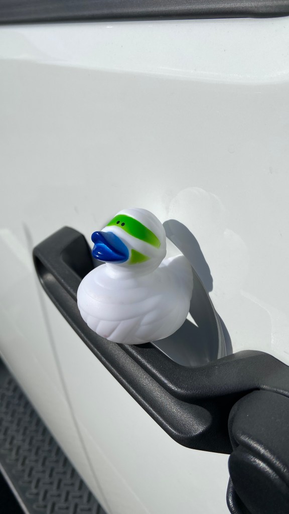 But last week, I had a whole new Jeep experience. I was at the park with a friend and when I returned to the Jeep there was a rubber duck on the driver’s side door handle. Just a cute little white duck with green and blue stripes smiling up at me as I unlocked the door. It gave me pause. At first, I wondered if this was some child’s misplaced toy? But then it dawned on me as I realized there was a Jeep parked next to me… this must be a Jeep thing. I hopped in and grabbed my phone to quickly google: Jeeps and Ducks.